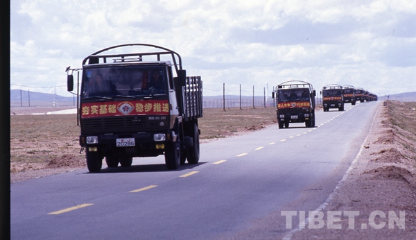 但是,青藏線最重要的使命不在于她為人們提供的觀光功能,而在于它承載了80%的進(jìn)藏物資的運(yùn)輸量。在西藏有一句話廣為人知:“青藏公路堵車一日,拉薩物價不穩(wěn)三天”,它可稱得上是西藏人民的“生命線”,青藏公路建成通車50年來,國家相繼投入近30億元進(jìn)行了三次大規(guī)模整改:1985年實現(xiàn)全線黑色化瀝青柏油路面;1999年消除水毀和凍土等病害隱患;2004年8月,長1160公里的青藏公路格拉段三期改造工程通過驗收,全球海拔最高的高原二級公路誕生,這使青藏公路的運(yùn)載能力大大提高。每天都有大量運(yùn)載貨物的大貨車行進(jìn)在這條道路上,幾十、上百輛大卡車整整齊齊魚貫行駛在青藏公路上,場面蔚為壯觀。不過這讓我們的超車成了問題,要想超過一個車隊,往往要花上一個多小時。