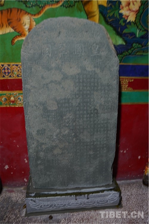 皇圖鞏固碑立于1817年,碑高約120厘米,寬60厘米。四周鐫刻“萬字格”花邊,無碑帽,碑額半圓形,碑身為方形,系青灰色石板鑿制而成,碑面少許被雨蝕脫皮的痕跡,碑文直書,字跡清晰,刻有“皇圖鞏固”四個大字,主要講述日喀則關(guān)帝廟興建始末。碑文主要記載了當時從內(nèi)地來藏戍邊的官兵,看到后藏地方風(fēng)雨失調(diào)收成不好,無力幫助當?shù)孛癖姼脑熳匀幻馐転?zāi)害,就按照內(nèi)地風(fēng)俗把希望寄托于神靈的保佑,集資興建了紅廟,把內(nèi)地神祇(財神、龍王、土地)搬到后藏供奉,以幫助后藏人民解除旱澇之苦。該碑是研究當時駐江孜、定日清軍的重要資料。