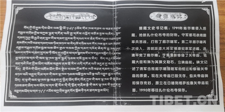 重修關(guān)帝廟碑立于1794年,碑形為長方形,無碑帽、碑座,以青灰色石板鑿制而成,石質(zhì)堅硬,平整光滑,四邊規(guī)整,由于多年風(fēng)雨侵蝕個別字無法識別。碑文由當時駐藏大臣和琳(和珅之弟)撰寫,碑文主要講述了關(guān)帝廟重建始末。乾隆五十六年左右,廓爾喀入侵日喀則,洗劫班禪駐錫地,乾隆帝派??蛋猜时安卣饔?,七戰(zhàn)七捷,將廓爾喀人驅(qū)逐出境,并兵逼廓爾喀都城“陽布”(今加德滿都),期間出現(xiàn)掘地得水、天氣突變凍斃廓爾喀士兵等事件,清軍士兵皆認為是關(guān)帝顯靈,感關(guān)帝護佑之恩,于是重建關(guān)帝廟。