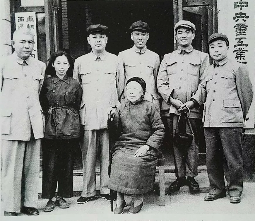 1951年4月,何香凝看望解放后第一批回國(guó)的印尼華僑回國(guó)工商業(yè)考察團(tuán)。中坐者為何香凝,后排站立左一為王源興、左三為黃潔、左四為家父李祝朝、左五為薛兩清、左六為施子卿。
