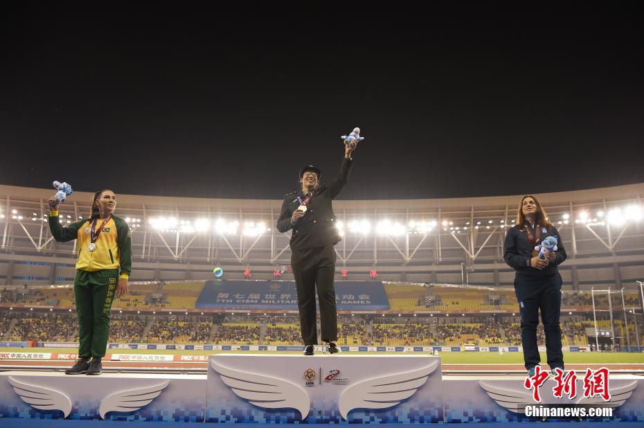 10月24日晚,第七屆世界軍人運(yùn)動會女子鐵餅決賽在湖北省武漢市舉行,中國選手馮彬以64米83奪得冠軍。圖為馮彬在頒獎(jiǎng)儀式上。中新社記者 侯宇 攝