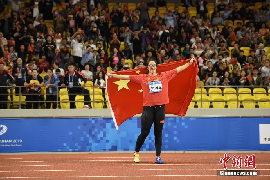 10月24日晚,第七屆世界軍人運(yùn)動會女子鐵餅決賽在湖北省武漢市舉行,中國選手馮彬以64米83奪得冠軍。圖為馮彬慶祝奪冠。中新社記者 侯宇 攝