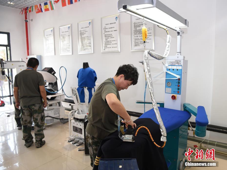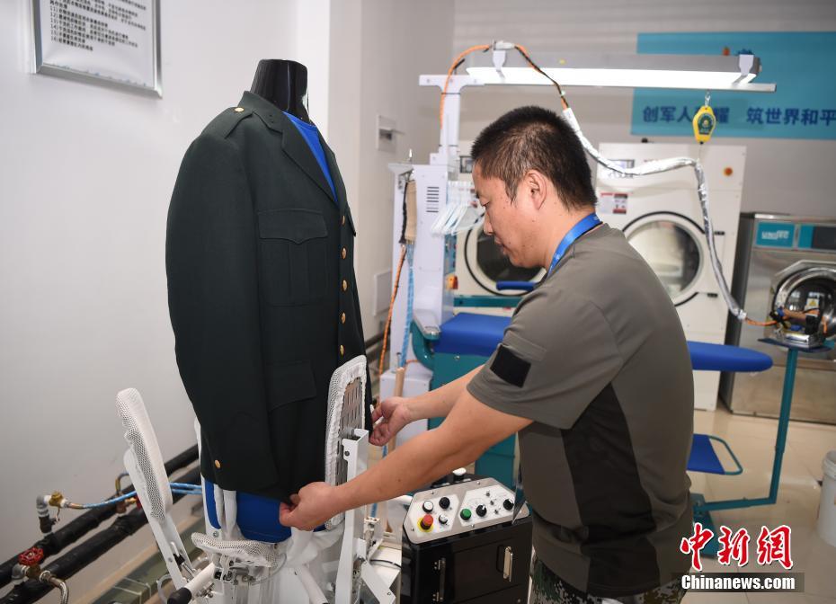 龔寶翠在熨燙軍裝。洗滌服務(wù)保障組工作間面積不大,但干洗機、熨燙機、洗鞋機等各式設(shè)備一應(yīng)俱全。中新社記者 侯宇 攝