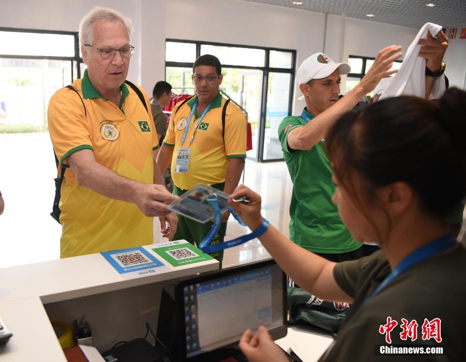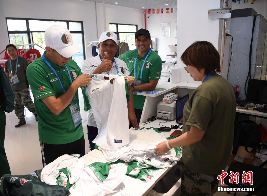 阿爾及利亞代表團的運動員和官員前來領(lǐng)取洗好的隊服,對洗滌保障組精細的服務(wù)豎起大拇指。中新社記者 侯宇 攝