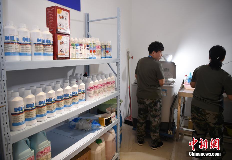 軍嫂龔寶翠和同事在工作間作業(yè)。洗滌服務(wù)保障組使用的洗滌劑等均達到了相應(yīng)的標準。中新社記者 侯宇 攝