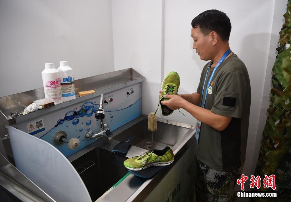 退伍軍人王勇在清洗一雙運動鞋。配合專用的洗鞋器具,能把鞋的各處清洗干凈。中新社記者 侯宇 攝