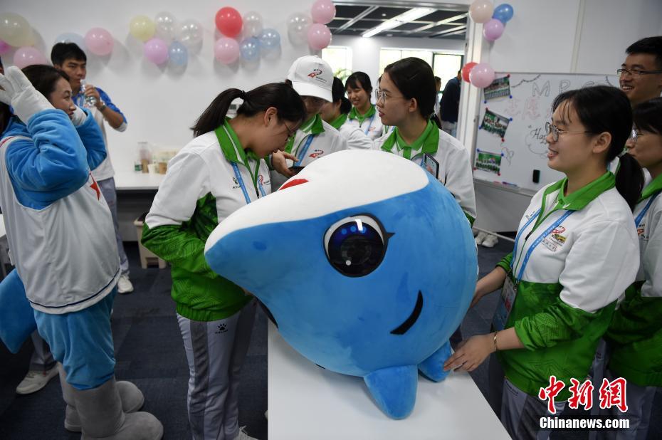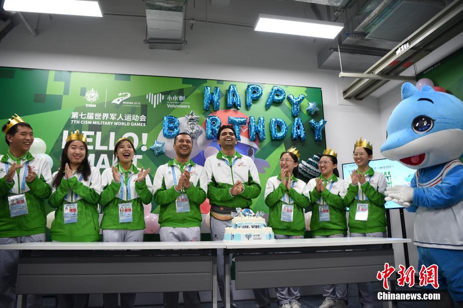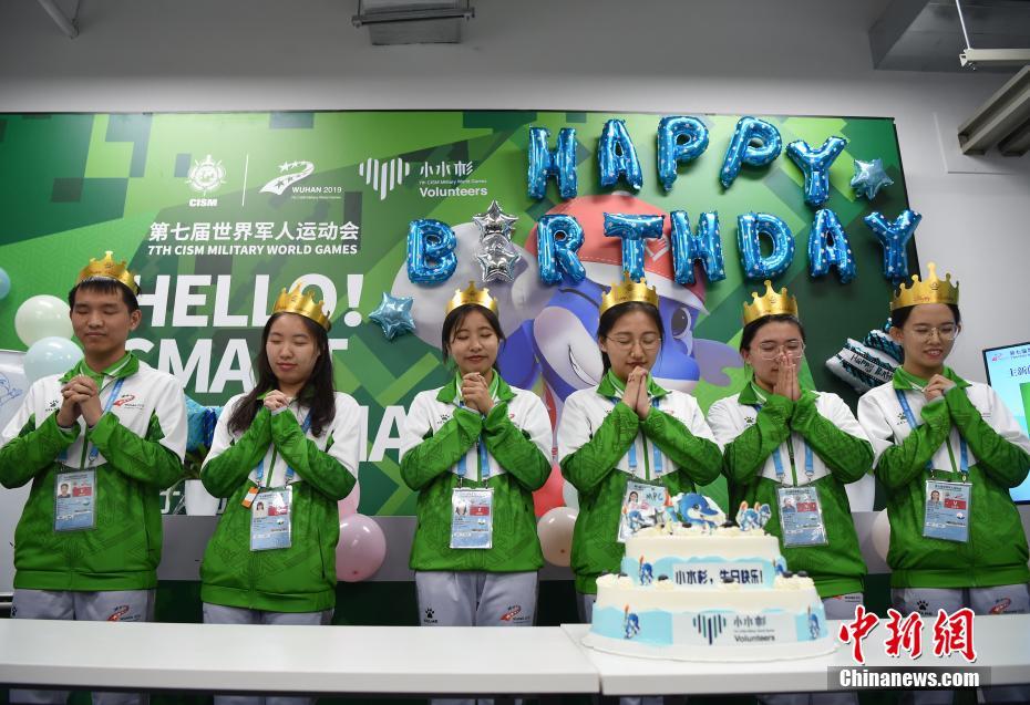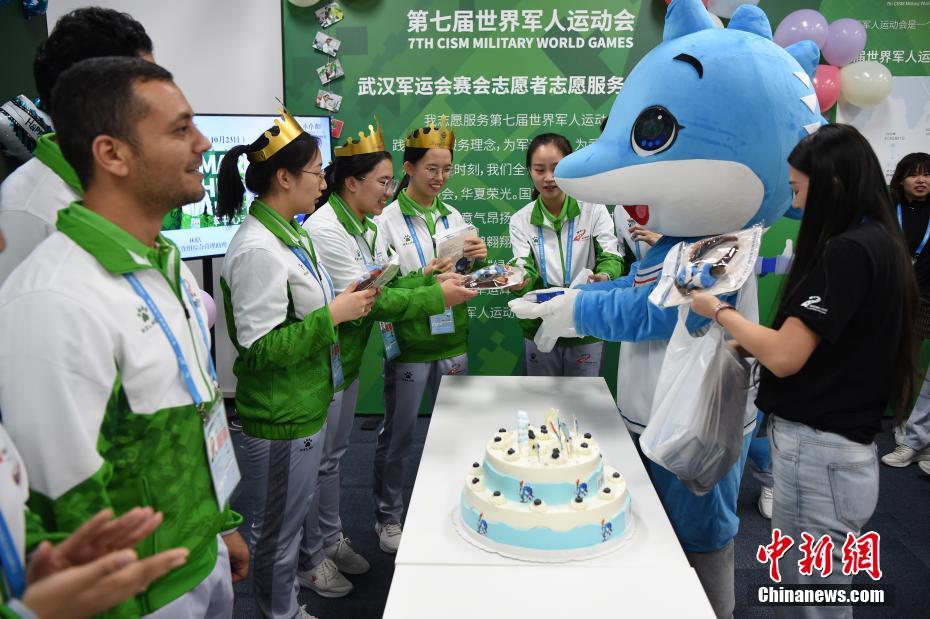 10月24日,幾位在第七屆世界軍人運動會舉辦期間迎來生日的志愿者“小水杉”在主媒體中心內(nèi)的“志愿者之家”過集體生日。圖為軍運會吉祥物“兵兵”向過生日的志愿者們送上小禮物。中新社記者 侯宇 攝