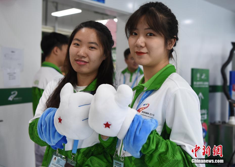 10月24日,幾位在第七屆世界軍人運動會舉辦期間迎來生日的志愿者“小水杉”在主媒體中心內(nèi)的“志愿者之家”過集體生日。圖為兩名志愿者帶著軍運會吉祥物“兵兵”的手套合影。中新社記者 侯宇 攝