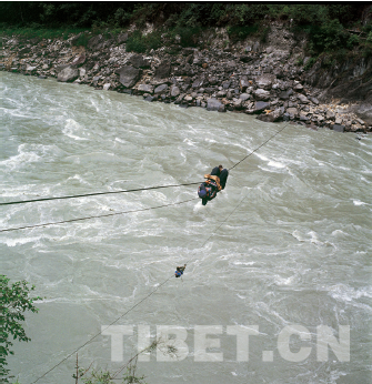 過溜索:上行和下行的索道上有人同時(shí)過江