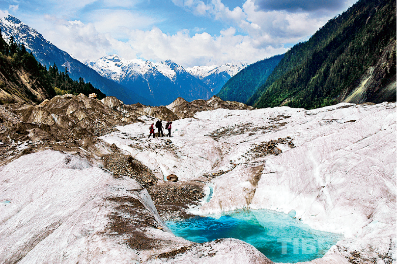 在諸源中確認(rèn)正源,一般遵循四條件:一是河長,它必須最長;二是流量,它應(yīng)該是水量最大的;三是流域面積寬廣。三點(diǎn)以外,另有一個(gè)人文因素需參考:民族習(xí)慣,當(dāng)?shù)貍鹘y(tǒng)看法。一行人策馬上行杰馬央宗冰川,流下大江第一滴水的地方。那里荒涼而壯闊,隨處可見冰川退縮后的終磧壟和側(cè)磧壟,間有一汪汪冰川小湖泊。杰馬央宗,藏語是“沙子堆成的雍仲圖案”之意。雍仲“卍”(讀音“萬”),是本土宗教苯教的標(biāo)志性圖案,寓意永恒輪轉(zhuǎn)、萬世不息??梢姀南让駮r(shí)代起,人們就視河源處為神圣之地。