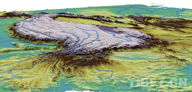 青藏高原衛(wèi)星圖片上,藍(lán)色的水系是根據(jù)原始數(shù)據(jù)繪制的。自右至左為:黃河,金沙江—長江,瀾滄江—湄公河,怒江—薩爾溫江,雅魯藏布江—布拉馬普特拉河,獨(dú)龍江—伊洛瓦底江。左上角阿里境內(nèi)的獅泉河、象泉河、孔雀河等外流河,分別成為印度河、恒河的源頭或上源支流 楊經(jīng)綏/供圖