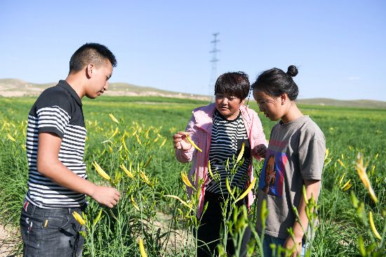 7月4日,在寧夏吳忠市太陽山清泉林業(yè)專業(yè)合作社的黃花菜地內,負責人李志巧正在教兩名勤工儉學的孩子如何采摘黃花菜。