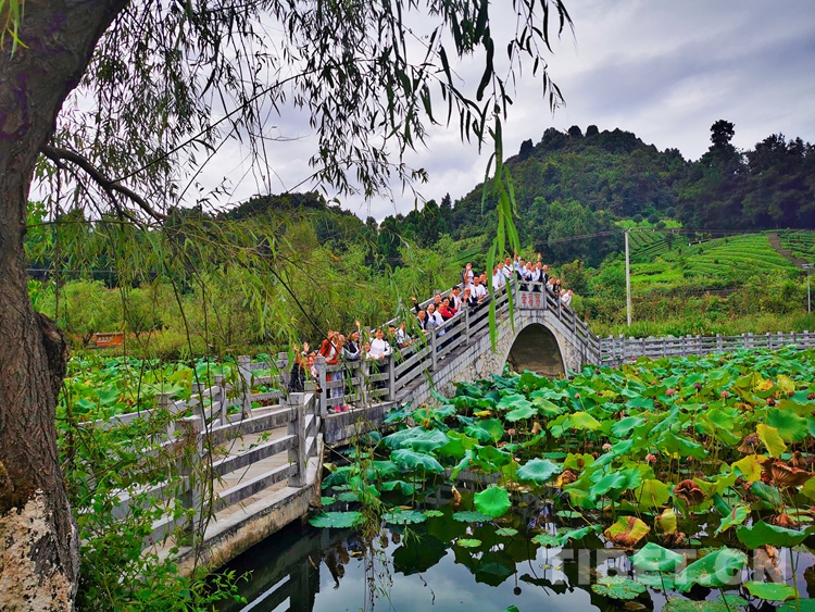圖為旅游團在貴州省湄潭縣龍鳳村田家溝的“幸福橋”合影留念
