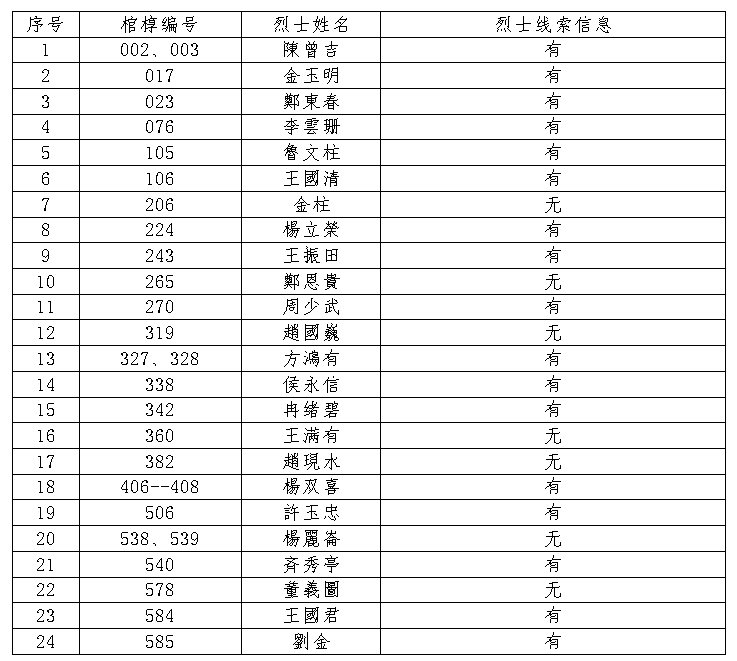 從今天起,我們?yōu)樽?014年起遷回沈陽安葬的在韓志愿軍烈士遺骸尋找親屬。慰籍烈士的英靈,告慰烈士的親人。活動期待著您的參與,期待著您的幫助。希望大家共同努力讓英烈事跡永遠(yuǎn)流傳,精神流芳千古。