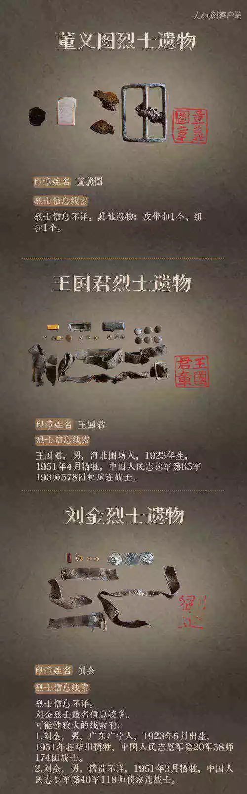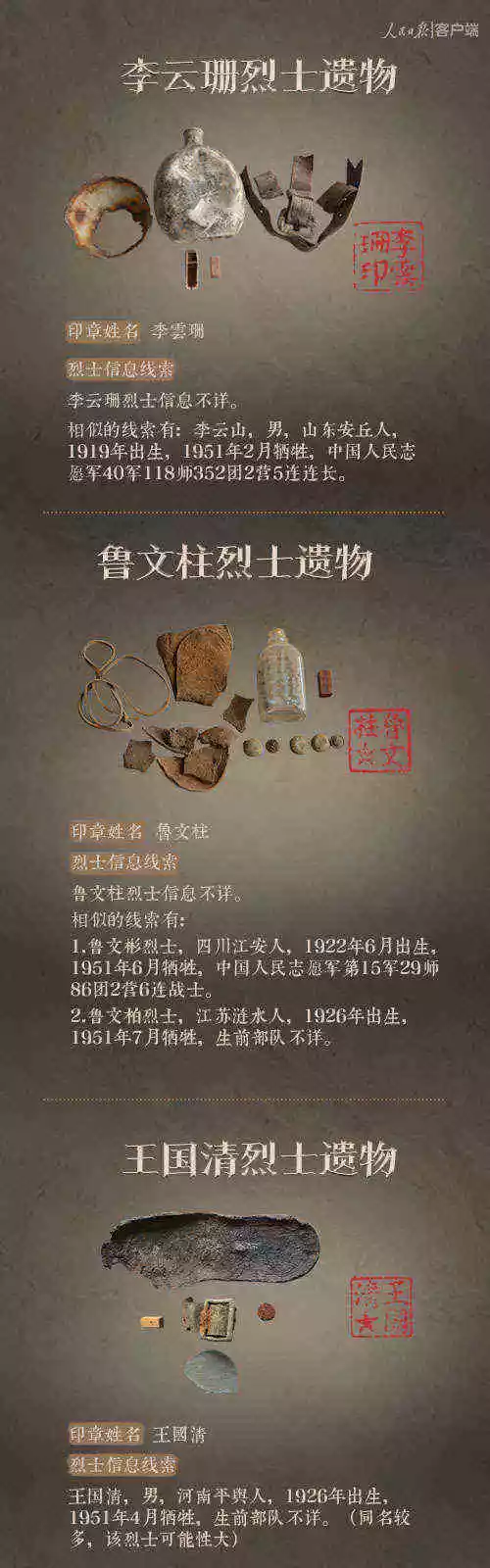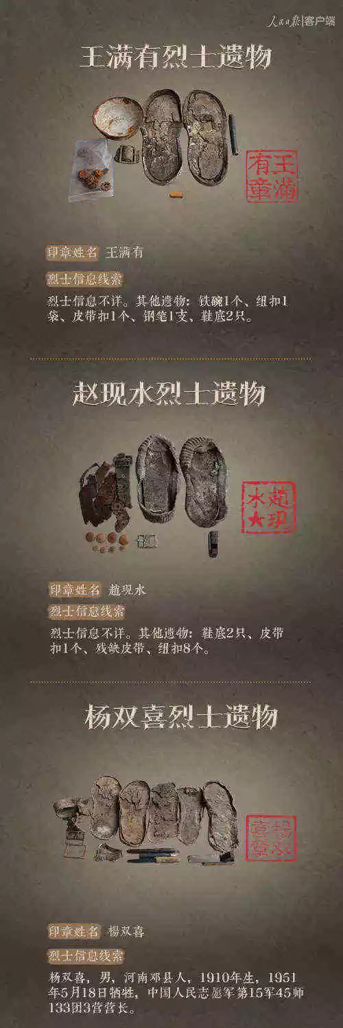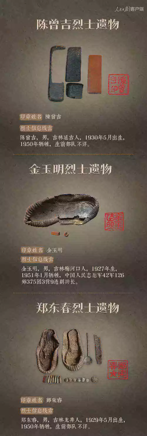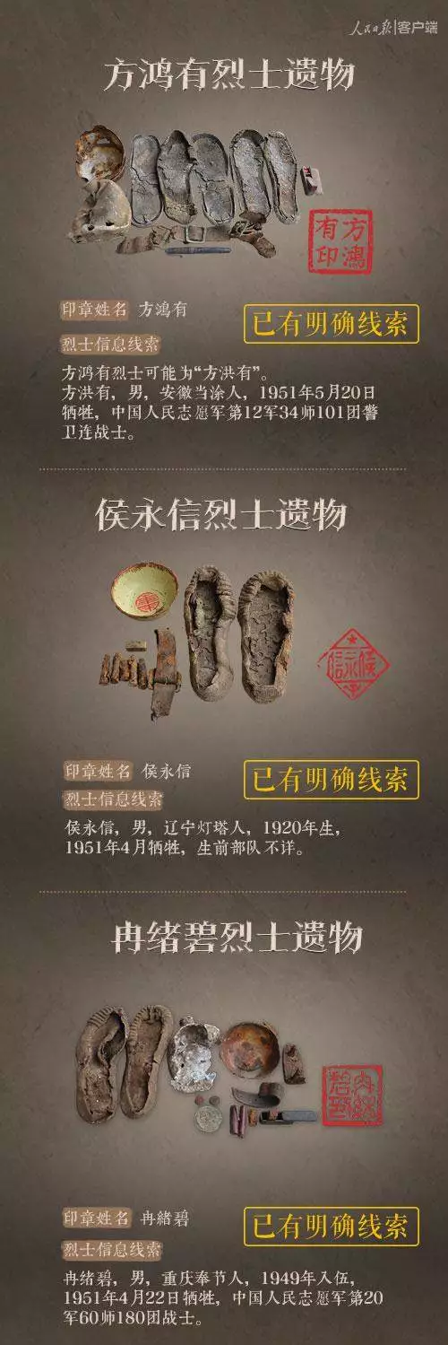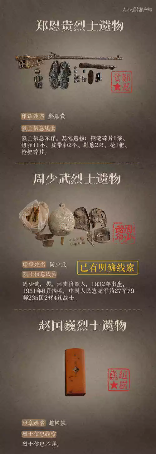 2014年以來,先后有五批589位在韓志愿軍烈士遺骸回到祖國懷抱。退役軍人事務部從這些烈士的上千件遺物中,發(fā)現了姓名文字圖案清晰可見的24枚印章。近日與人民日報新媒體等共同發(fā)起#尋找英雄#媒體行動,向全社會征集這24位烈士親屬線索。3月29日,人民日報客戶端、法人微博、微信公號同時發(fā)布稿件《當年,他們?yōu)槲覀儬奚?;今天,請為他們做一件事》,向社會介紹“尋找英雄”活動,并公布24位烈士的基本情況和遺物信息。