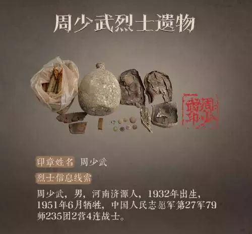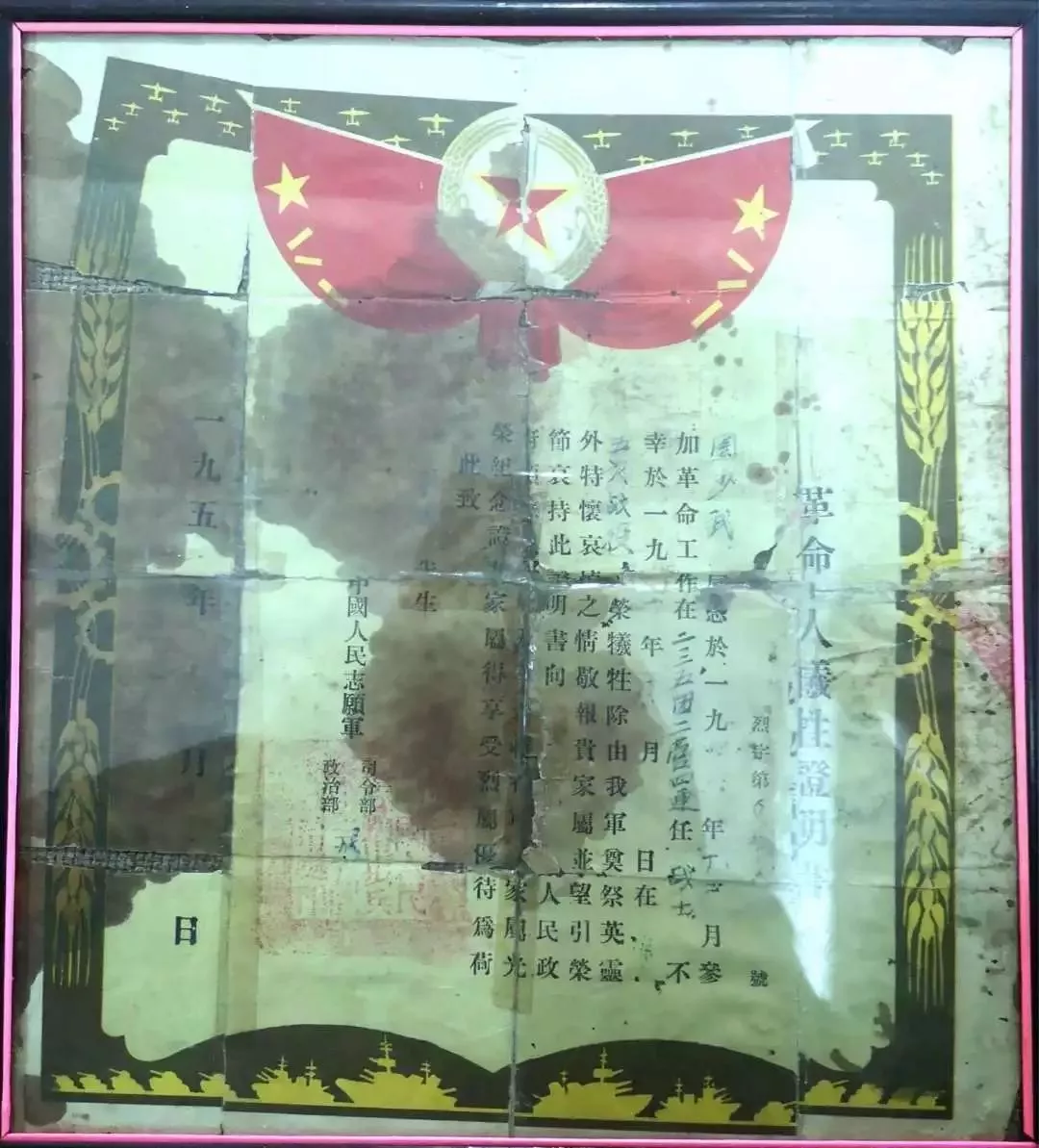 周少武同志于1949年12月參加革命工作,在二三五團(tuán)二營四連任戰(zhàn)士,不幸于1951年6月在第五次戰(zhàn)役光榮犧牲。除由我軍奠祭英靈外,特懷哀悼之情,敬報(bào)貴家屬并望引榮節(jié)哀。持此證明書向濟(jì)源縣人民政府領(lǐng)取撫恤金及革命犧牲家屬光榮紀(jì)念證,其家屬得享受烈屬優(yōu)待為荷。此致周狗毛先生。落款為中國人民志愿軍司令部和政治部,時(shí)間為1956年。