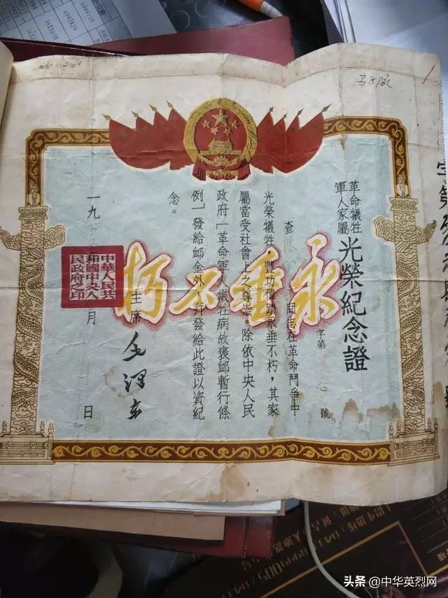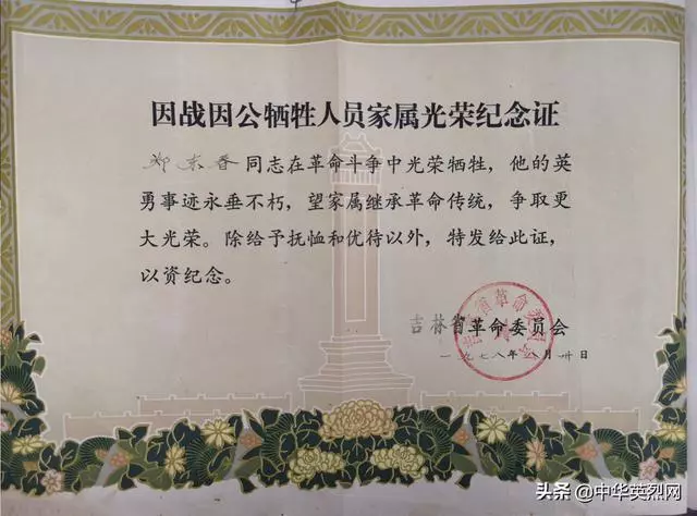 陳增吉烈士的烈士犧牲紀(jì)念證