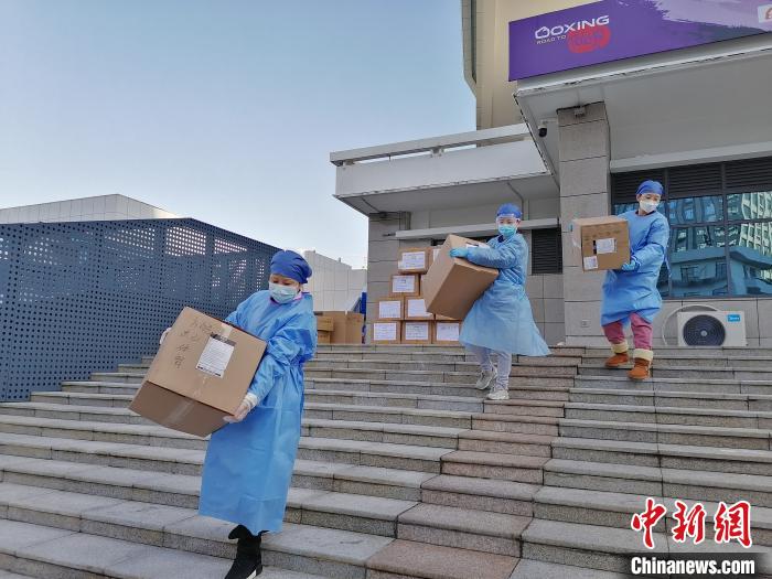 近日,武昌方艙醫(yī)院“管家”、武漢大學(xué)人民醫(yī)院對(duì)外聯(lián)絡(luò)部牽頭負(fù)責(zé)人沈嵐接受記者采訪。圖為沈嵐(左一)在方艙醫(yī)院搬運(yùn)物資。武大人民醫(yī)院供圖