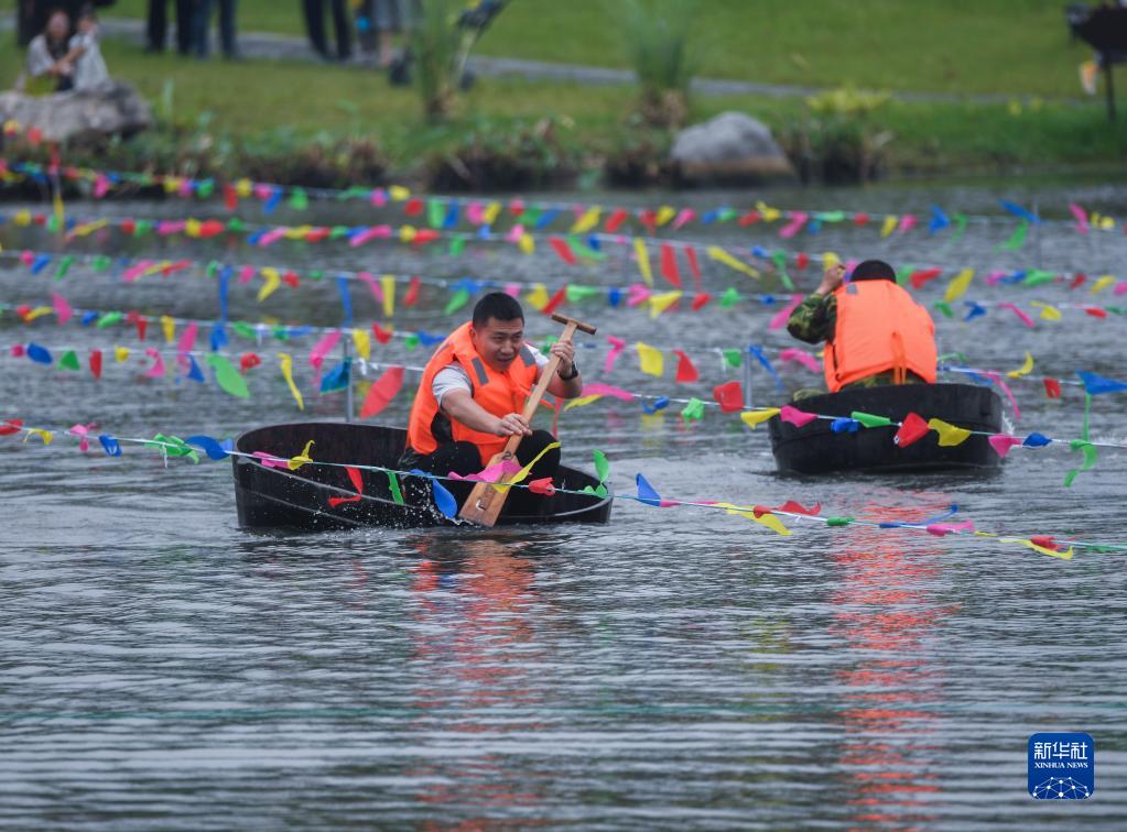 5月28日,在東林鎮(zhèn)保國村倪家灣港,村民們參加“慶端午 劃菱桶”趣味比賽。新華社記者 徐昱 攝