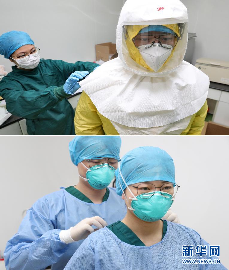 這張拼版照片顯示的是:2月25日,江蘇省南通市疾控中心病原微生物實驗室的檢測人員郭陳(左)在清潔區(qū)幫助丈夫季霄雷穿防護服、戴正壓面罩(上);4月26日,季霄雷(左)幫助郭陳穿防護服(下)。“五一”前夕,江蘇省南通市疾控中心病原微生物實驗室檢測組的90后黨員季霄雷和妻子郭陳以及其他同事依然堅守在疫情防控第一線。 新華社發(fā)(許叢軍 攝)