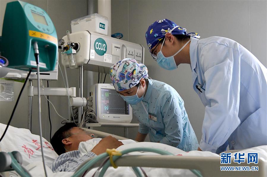 劉光耀(右一)和喬冰(右二)在河南省直第三人民醫(yī)院急重癥醫(yī)學中心病房內詢問病人情況(4月26日攝)。劉光耀和喬冰是河南省直第三人民醫(yī)院急重癥醫(yī)學中心的護士,也是一對“90后”情侶。新冠肺炎疫情發(fā)生后,他們一起報名申請到武漢一線支援。新華社記者李安攝