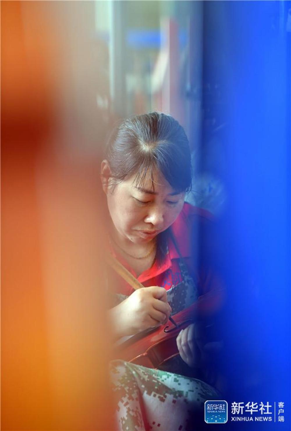 工人在河南駐馬店市確山縣提琴產(chǎn)業(yè)園提琴生產(chǎn)車間雕刻琴頭(7月3日攝)。新華社記者 李嘉南 攝