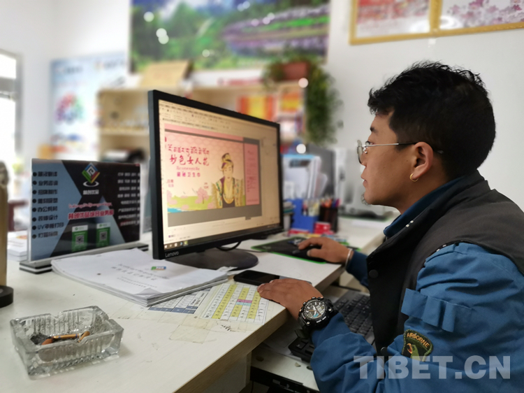 圖為拉巴次仁在設(shè)計(jì)“妙色女人花藏秘衛(wèi)生巾”包裝圖案
