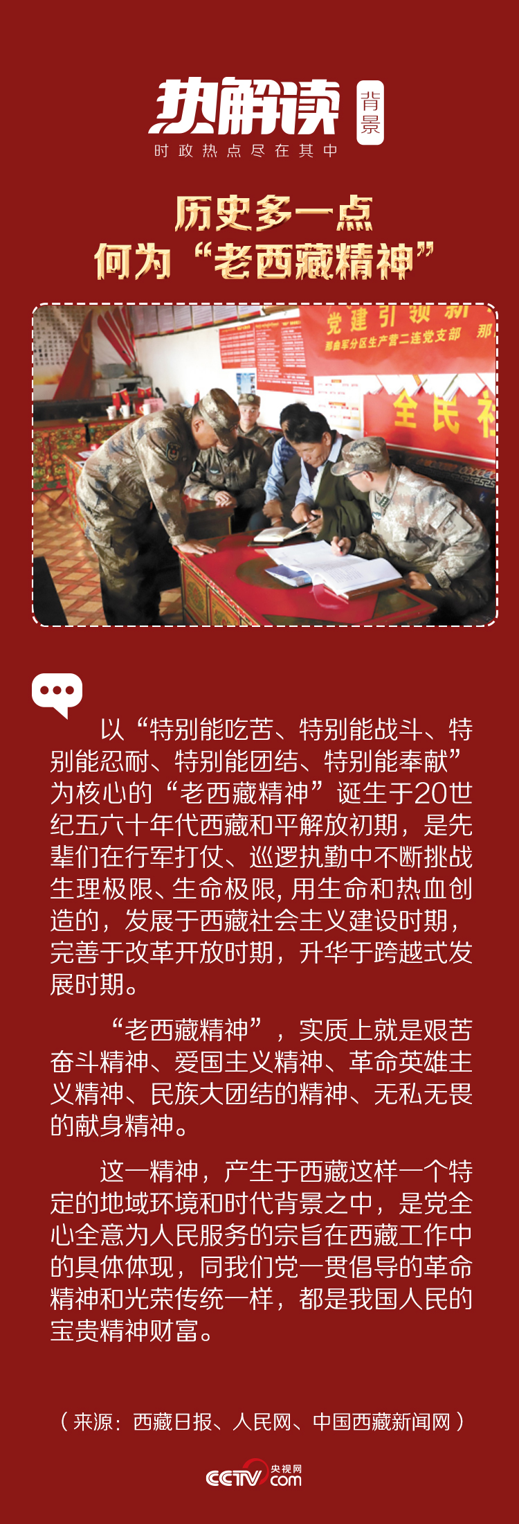 那些背著背包以雙腳征服14座海拔5000多米險峻雪山的中國人民解放軍將士,用軍魂熔鑄“老西藏精神”;寫出“冰山愈冷情愈熱,耿耿忠心照雪山”詩句的援藏干部孔繁森,用生命踐行“老西藏精神”;滔滔江河上搭金橋、重重險山間辟大道,迢迢天路無言訴說著“老西藏精神”;“玉麥每一個人都是祖國的坐標”,在西藏長達4000多公里的邊境線上,數不清的黨員干部默默踐行傳承著“老西藏精神”……