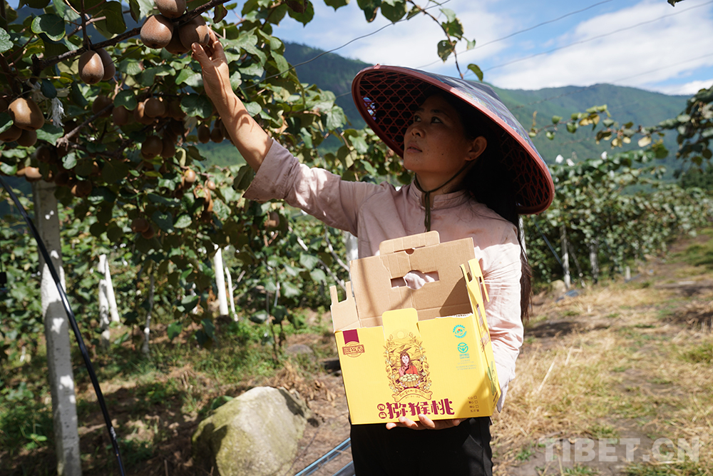 圖為老鄭的妻子在下察隅鎮(zhèn)夏尼村獼猴桃種植基地采摘獼猴桃 攝影:王淑