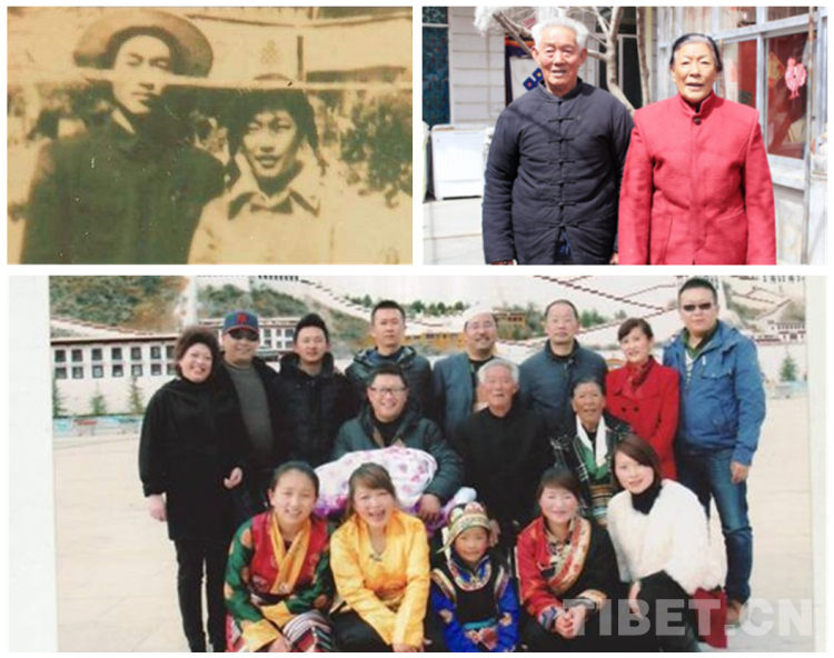 △圖為一個(gè)典型的“團(tuán)結(jié)族”幸福家庭。1959年,薄金清隨部隊(duì)來到西藏,轉(zhuǎn)業(yè)后到西藏自治區(qū)氣象局工作,1960年與藏族同事、大學(xué)生中巴桑結(jié)婚。而今,全家四世同堂生活在拉薩,20多口人中有藏、漢、回三個(gè)民族。左上為薄金清和中巴桑年輕時(shí)的合影,右上為薄金清和中巴桑2017年時(shí)的合影,下圖為薄金清和中巴桑一家全家福(圖片來源于央視、西藏發(fā)布、拉薩文明網(wǎng))