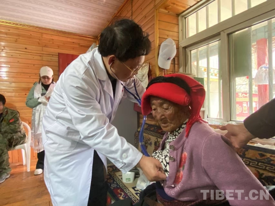 圖為“同心·共鑄中國心”醫(yī)務志愿者、廣東省中醫(yī)院心血管病??浦魅吾t(yī)師陳伯鈞為藏族阿媽查體