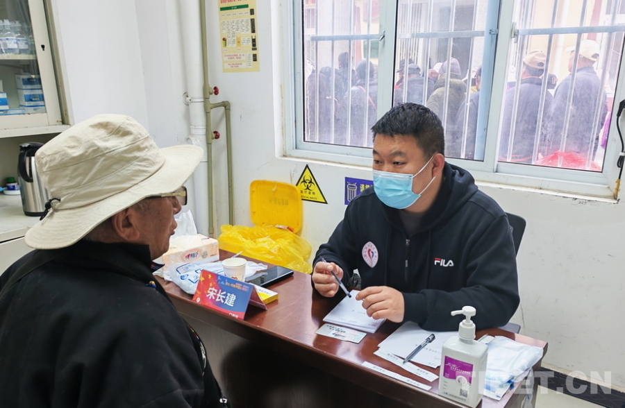 圖為火箭軍特色醫(yī)學(xué)中心口腔科醫(yī)師宋長(zhǎng)建在義診中詢問就醫(yī)群眾病情 攝影:馬濤