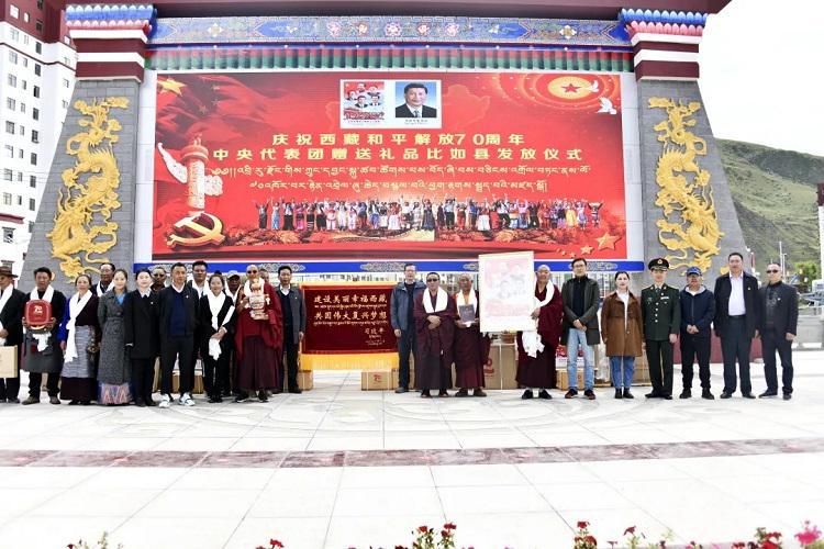 中國西藏網訊 為表達以習近平同志為核心的黨中央的親切關懷和全國人民的深情厚誼,出席西藏和平解放70周年慶?;顒拥闹醒氪韴F向西藏贈送多項紀念品。8月23日下午,西藏自治區(qū)那曲市比如縣隆重舉行中央代表團贈送禮品發(fā)放儀式。