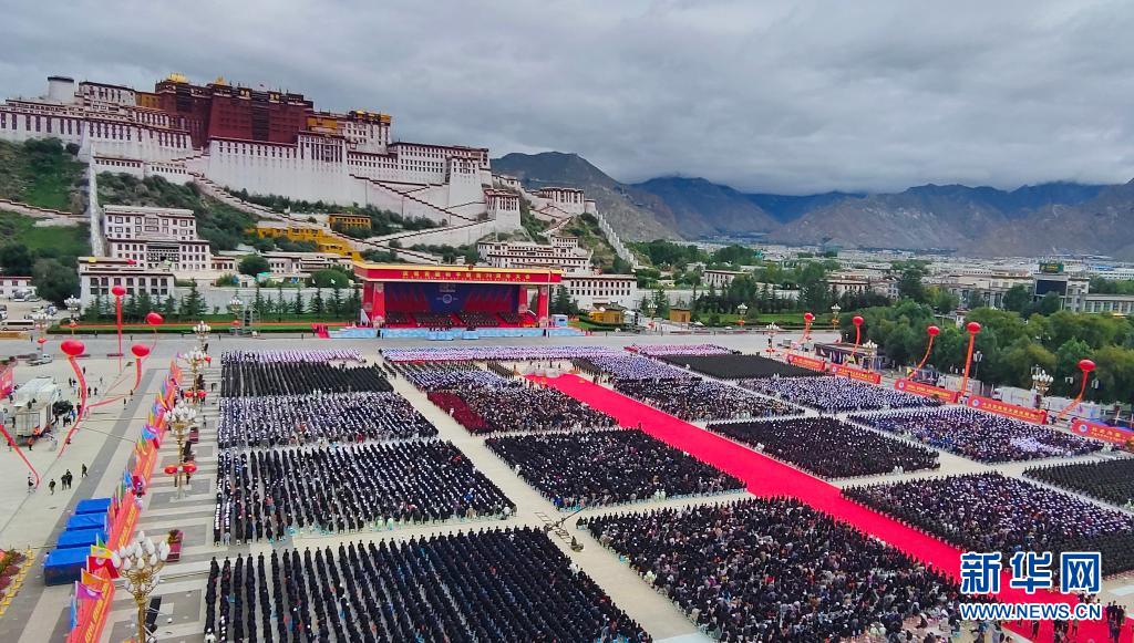 這是8月19日拍攝的慶祝西藏和平解放70周年大會現(xiàn)場。當日,西藏各族各界干部群眾2萬多人歡聚在拉薩布達拉宮廣場,熱烈慶祝西藏和平解放70周年。新華社記者 覺果 攝