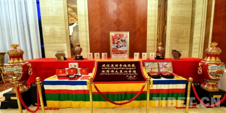 習(xí)近平總書記題詞的“建設(shè)美麗幸福西藏 共圓偉大復(fù)興夢想”賀匾