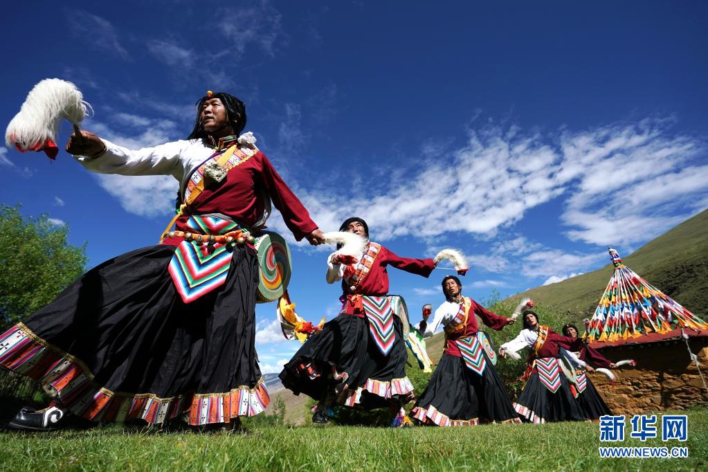在山南市瓊結(jié)縣,久河村卓舞隊(duì)的隊(duì)員在表演國家級(jí)非遺項(xiàng)目“久河卓舞”(2020年7月1日攝)。新華社記者 詹彥 攝