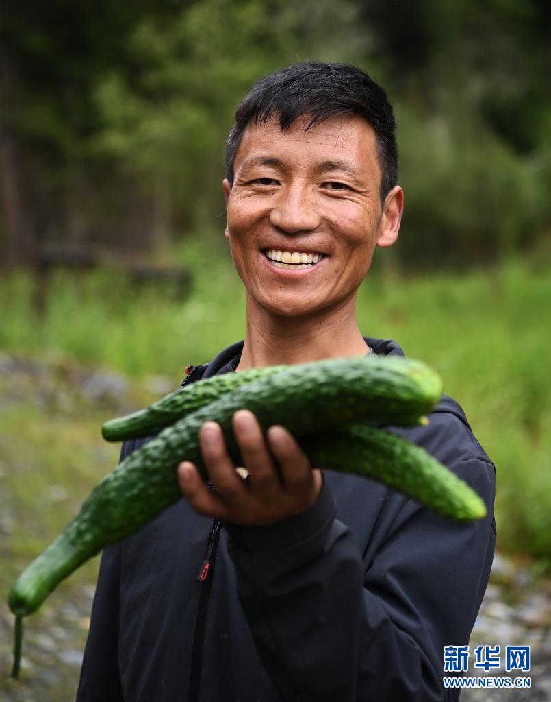西藏山南市隆子縣玉麥鄉(xiāng)村民展示大棚里采摘的黃瓜,這些黃瓜將通過合作社銷往各地(2020年7月30日攝)。新華社記者 普布扎西 攝