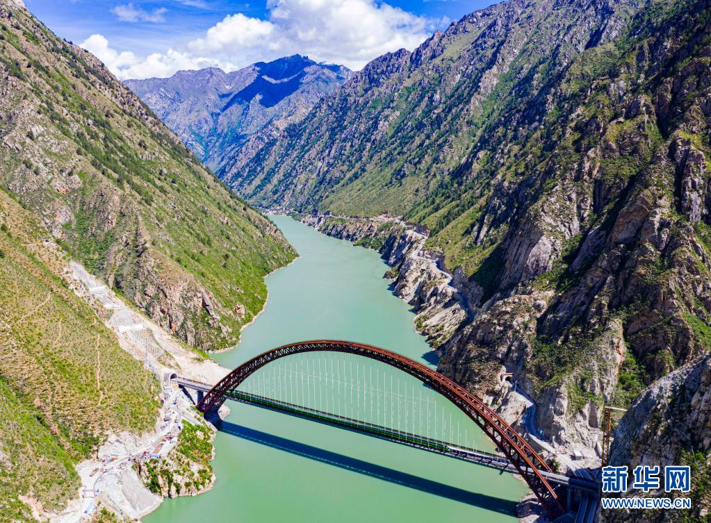 6月25日,全長435公里、設(shè)計(jì)時(shí)速160公里的拉林鐵路建成通車,西藏首條電氣化鐵路建成,同時(shí)復(fù)興號(hào)實(shí)現(xiàn)對(duì)31個(gè)省區(qū)市全覆蓋。這是試運(yùn)行的復(fù)興號(hào)列車行駛在藏木特大橋(無人機(jī)照片,6月17日攝)。新華社記者 普布扎西 攝