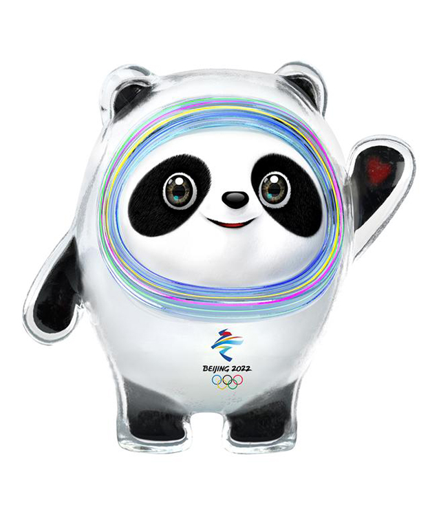 以熊貓為原型進行設計創(chuàng)作。將熊貓形象與富有超能量的冰晶外殼相結合,體現(xiàn)了冬季冰雪運動和現(xiàn)代科技特點。頭部外殼造型取自冰雪運動頭盔,裝飾彩色光環(huán),其靈感源自于北京冬奧會的國家速滑館——“冰絲帶”,流動的明亮色彩線條象征著冰雪運動的賽道和5G高科技;左手掌心的心形圖案,代表著主辦國對全世界朋友的熱情歡迎。整體形象酷似航天員,寓意創(chuàng)造非凡、探索未來,體現(xiàn)了追求卓越、引領時代,以及面向未來的無限可能。