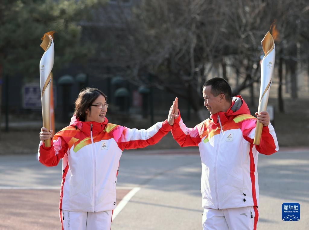 3月3日,火炬手中國殘疾人聯(lián)合會理事、體育部主任趙素京(左)和中國殘疾人體育運動管理中心主任吳競軍在傳遞火炬。新華社記者 杜瀟逸 攝