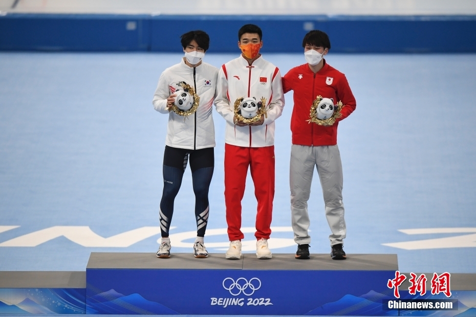 2月12日,北京2022年冬奧會速度滑冰男子500米決賽在國家速滑館“冰絲帶”舉行。中國選手高亭宇以34.32秒的成績打破奧運會紀錄,奪得冠軍。這是中國首次在冬奧會速度滑冰男子項目獲得金牌。圖為高亭宇(中)在頒發(fā)紀念品儀式上。 中新社記者 李駿 攝