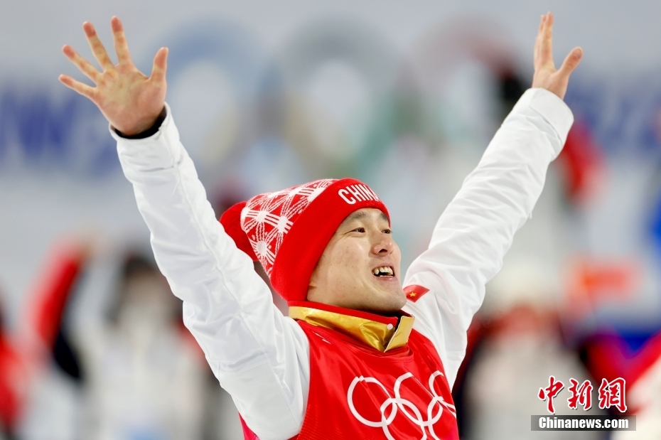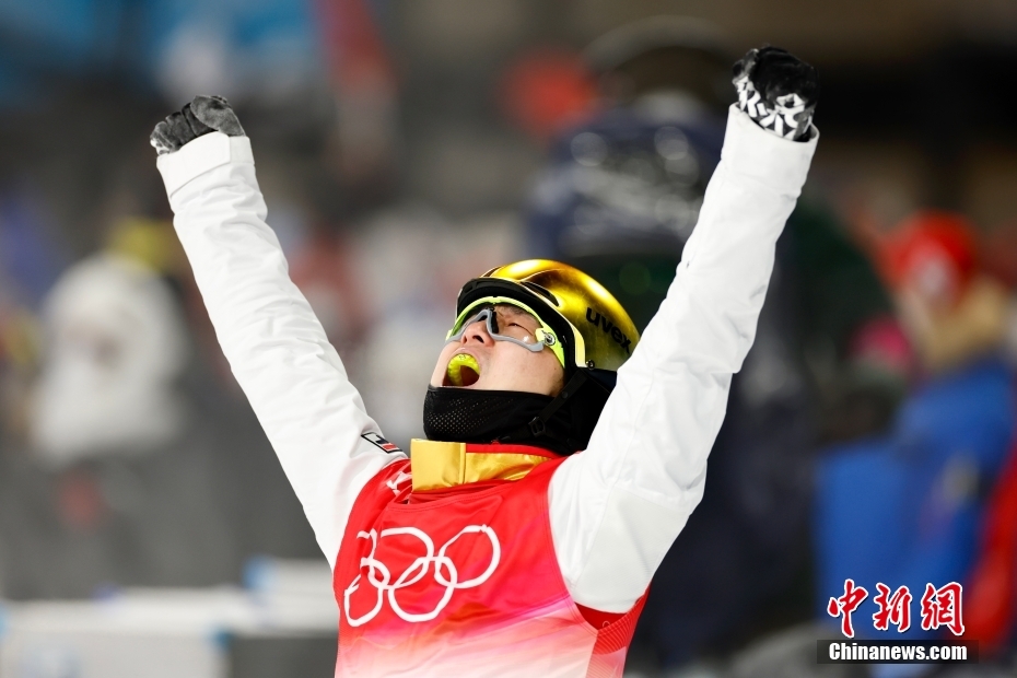 2月16日,中國選手齊廣璞在比賽后慶祝。當日,北京2022年冬奧會自由式滑雪男子空中技巧決賽在張家口賽區(qū)舉行,中國選手齊廣璞奪得冠軍。 中新社記者 富田 攝
