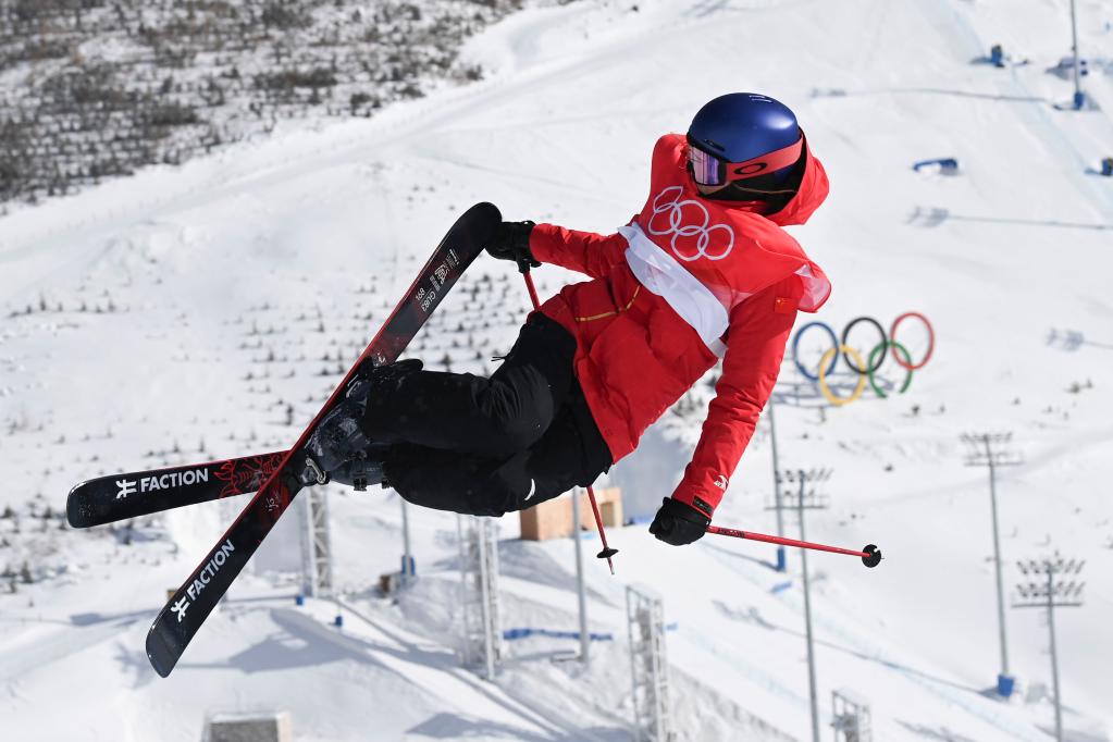 2月16日,中國(guó)隊(duì)選手齊廣璞在自由式滑雪男子空中技巧決賽中。新華社記者朱崢攝
