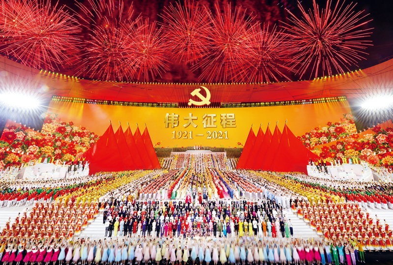 在百年奮斗歷程中,中國共產(chǎn)黨團(tuán)結(jié)一切可以團(tuán)結(jié)的力量、調(diào)動一切可以調(diào)動的積極因素,最大限度凝聚起共同奮斗的力量,推動著中國發(fā)展進(jìn)步的歷史車輪滾滾向前。2021年6月28日晚,慶祝中國共產(chǎn)黨成立100周年文藝演出《偉大征程》在國家體育場盛大舉行。圖為文藝演出結(jié)束,全場共同高唱《沒有共產(chǎn)黨就沒有新中國》。 新華社記者 龐興雷/攝