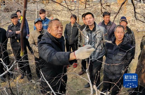 2016年1月27日,李保國(前左)在河北省內(nèi)丘縣崗底村向村民講解果樹修剪知識。新華社記者 朱旭東 攝