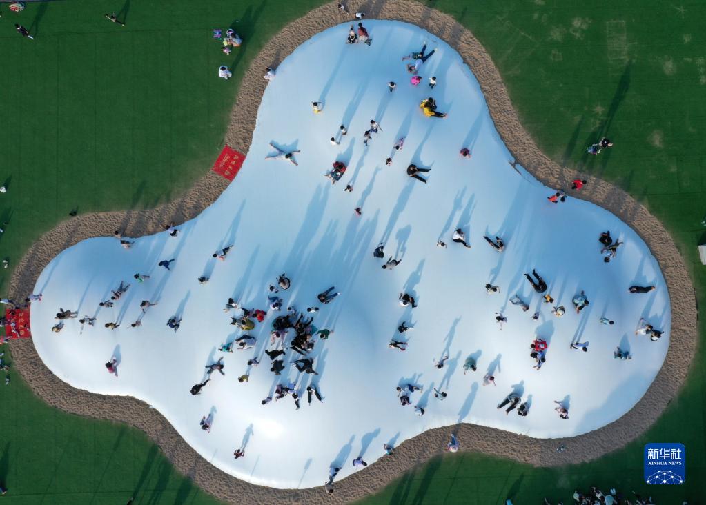 在江西省贛州市章貢區(qū)沙河鎮(zhèn)的羅坑體育特色小鎮(zhèn),游客在體驗(yàn)戶外蹦床項(xiàng)目(2020年11月15日攝,無(wú)人機(jī)照片)。新華社記者 彭昭之 攝