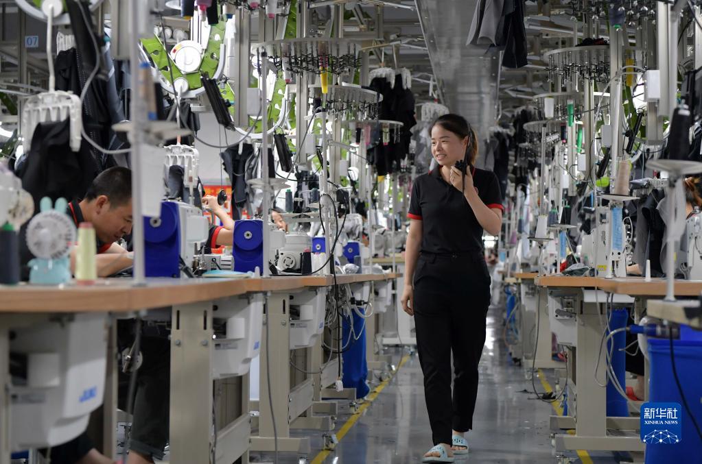 在江西省于都縣一家服裝生產(chǎn)基地內(nèi),生產(chǎn)小組小組長(zhǎng)在巡查生產(chǎn)線(2020年7月17日攝)。新華社記者 彭昭之 攝