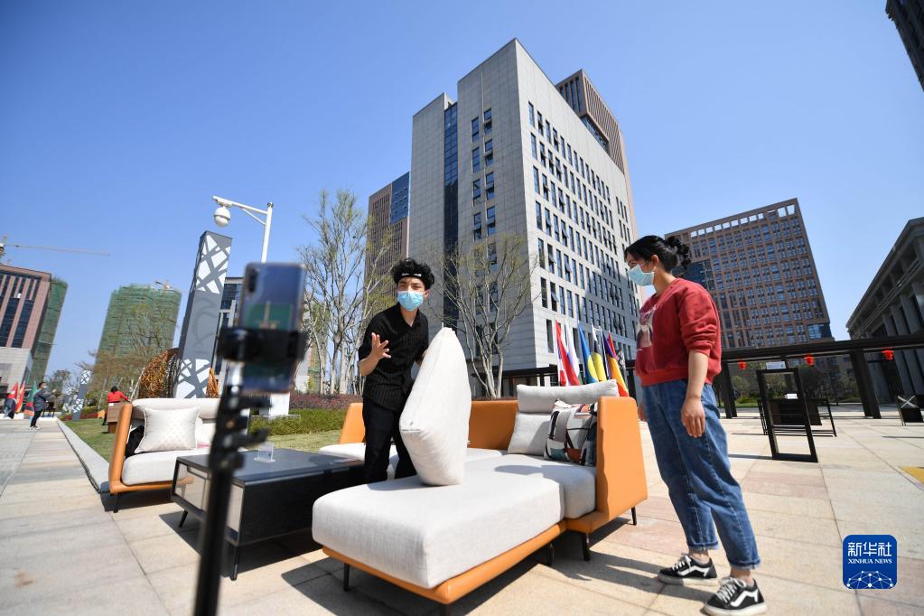 在江西省贛州市南康區(qū)跨境電商產(chǎn)業(yè)園,員工通過(guò)手機(jī)直播的形式推銷家具(2020年2月26日攝)。新華社記者 胡晨歡 攝