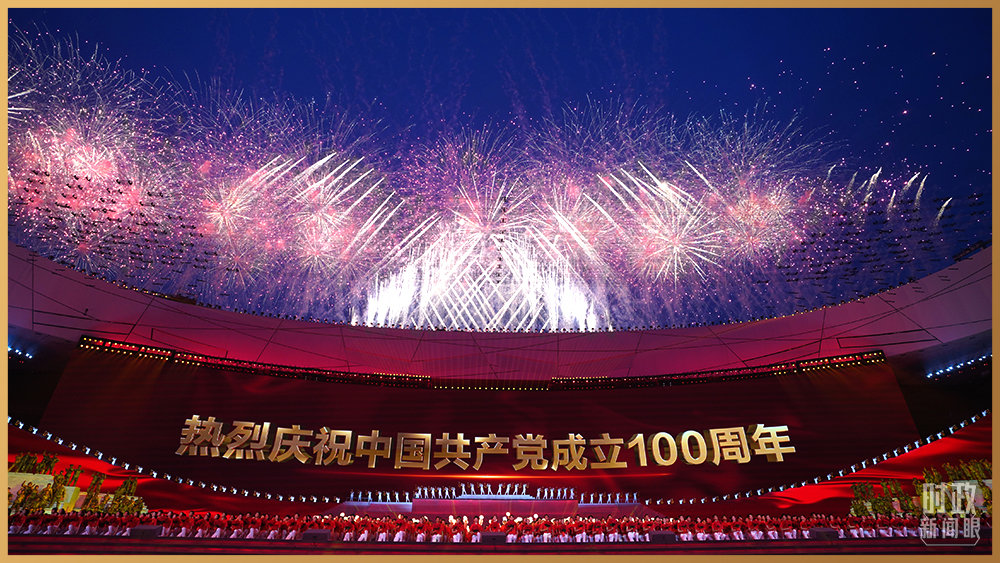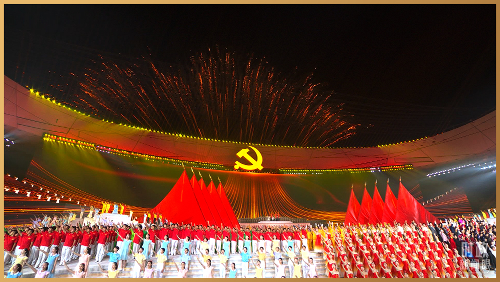 情景交響歌舞《人民至上》,再現(xiàn)舉國動員、全民戰(zhàn)“疫”。鼓樂歌舞節(jié)目《新的天地》,一百面空中大鼓與地面巨型大鼓遙相呼應(yīng)。在主題曲《領(lǐng)航》的旋律中,高達(dá)16米的金色黨徽在國家體育場莊嚴(yán)升起。演出過程中,絢爛的焰火一次次盛放在國家體育場上空,并迅速在網(wǎng)上引發(fā)刷屏。