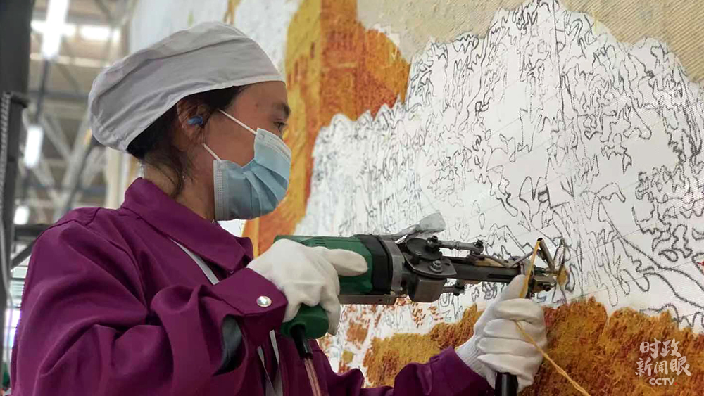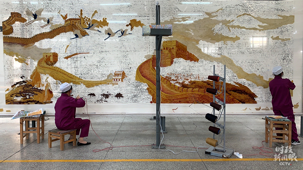 這幅手工槍刺藏毯以長城為原型,面積接近14平方米。兩人同時(shí)操作需兩個(gè)月時(shí)間完成。(總臺(tái)央視記者王鵬飛、楊松濤拍攝)